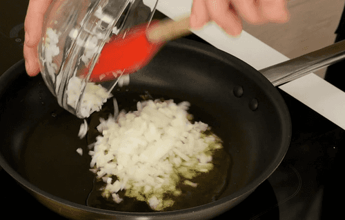 В сковороде на оливковом масле обжарить мелко нарезанный лук.