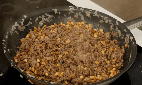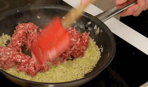 Добавить половину фарша, перемешать, разбивая его лопаткой.