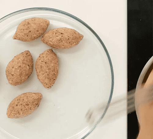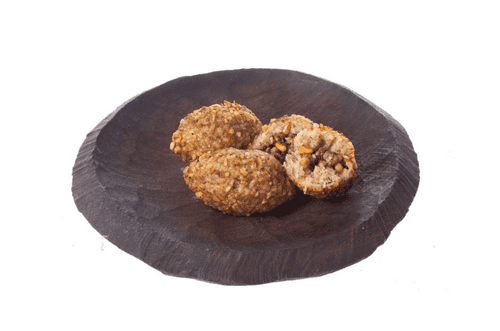 Смоченными в холодной воде руками взять тесто из булгура объемом с яйцо, скатать из него шар, затем пальцем продавить в нем углубление. Положить в углубление начинку, аккуратно закрыть отверстие и придать пирожку форму с вытянутыми концами, напоминающую лимон.