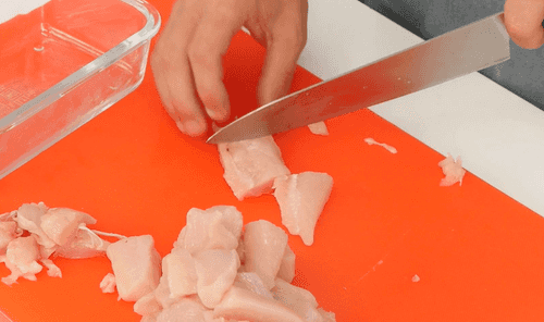 Куриную грудку нарезать на небольшие, одинаковые по размеру кусочки.