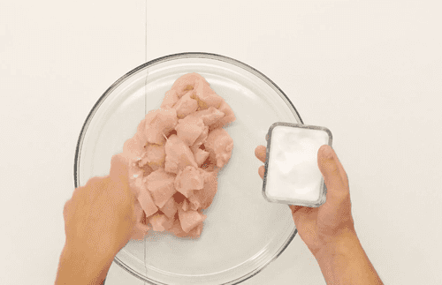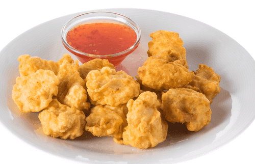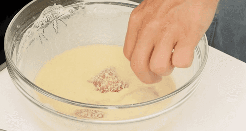 Наггетсы обмакнуть в кляр и сразу же погрузить в горячее масло.