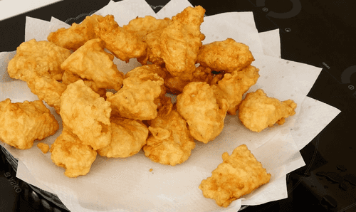 Готовые наггетсы выложить на бумажные полотенца, чтобы ушел лишний жир.