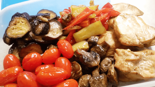 Включить духовку на 180–200 градусов, противень смазать маслом, выложить на него курицу, все промаринованные овощи и помидоры. Сбрызнуть их маслом и посыпать приправами. Помидоры можно посолить.