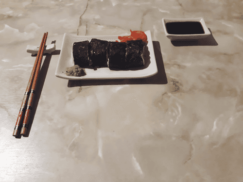 Рулет разрезать на роллы, готовое блюдо подать с соевым соусом, имбирем и васаби.