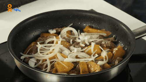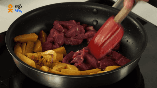 Раскалить сковороду и на растительном масле обжарить тыкву до полуготовности. Добавить мясо к тыкве, на среднем огне обжарить, помешивая, 3–4 минуты.
