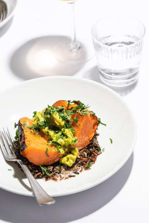 Батат с кремом из авокадо и диким рисом