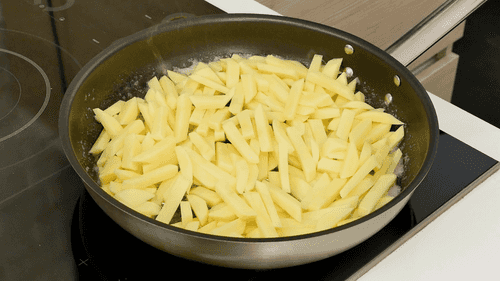 Жарить в течение 15–20 минут, стараясь мешать картошку как можно реже и аккуратнее, чтобы не разрушить бруски.