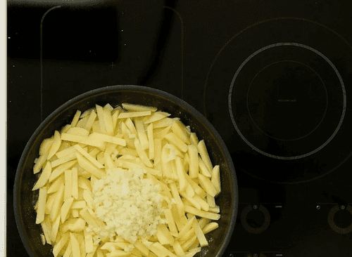 Понизить огонь до средне-низкого и выложить картошку в один или максимум два слоя и жарить, не мешая, 5–7 минут.