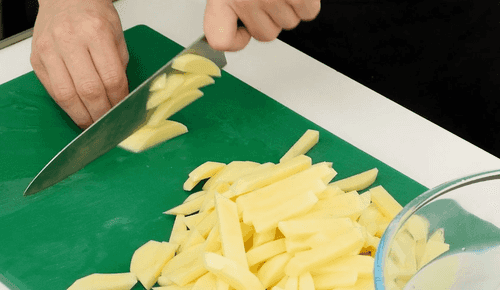 Картофель очистить, нарезать одинаковыми кусочками, не очень важно, будут это бруски или дольки. От способа и размера нарезки будет меняться время приготовления.
