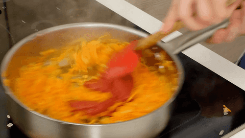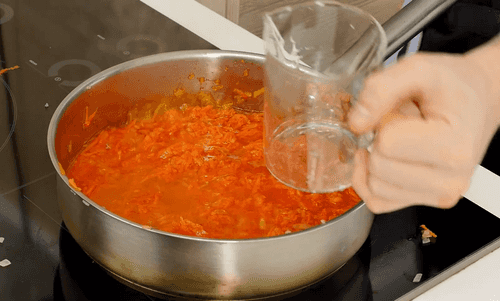 Добавить морковь, жарить, помешивая, еще пару минут.
