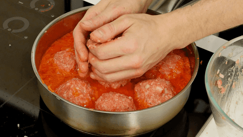 Сформовать из фарша шарики одинакового размера, выложить их в сковороду, накрыть крышкой.