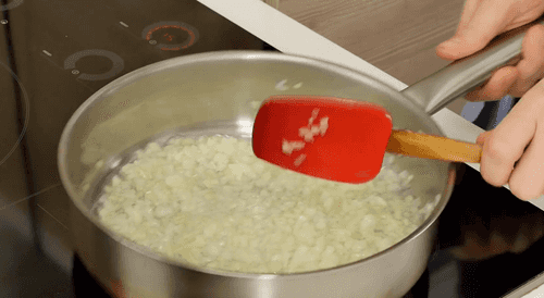 Разогреть в глубокой сковороде растительное масло, обжарить лук, пока он не станет прозрачным.