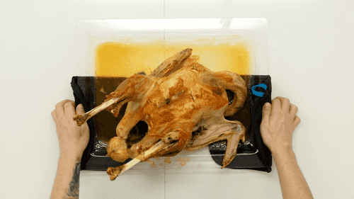 Разогреть духовку до 180 градусов, поместить туда индейку, а на дно духовки поставить емкость с водой, это поможет мясу остаться сочным. Запекать в течение часа или пока индейка не подрумянится.