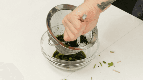 Кинзу пробить блендером с добавлением небольшого количества воды, воды должно быть ровно столько, сколько нужно, чтобы помочь блендеру справиться с задачей. Затем процедить эту зеленую массу через сито или марлю. Нужен только сок.