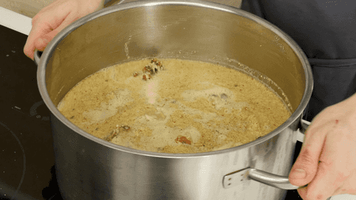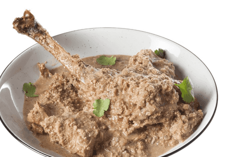 Полтора-два литра бульона довести до кипения, постепенно добавить в него ореховую смесь, помешивая деревянной ложкой, затем добавить лук, также помешивая, в конце индейку.