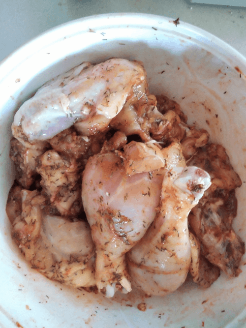 Курицу помыть, убрать шкуру, разделить на части и переложить в глубокую миску. Добавить паприку, укроп, черный молотый перец, соль и чеснок, предварительно его раздавив. Сбрызнуть оливковым маслом. Все хорошо перемешать. Выложить в форму и закрыть фольгой.