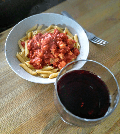 В конце, минуты за 4 до готовности пасты, нарезать кусочками рыбу (это может быть любая рыба с белым мясом) и выложить ее в сковороду. Хорошо перемешать, при необходимости добавить соль, накрыть крышкой и оставить томиться.