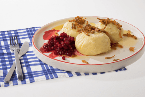 В большой кастрюле вскипятить воду, подсолить ее и варить кроппкакур 5–6 минут пока они не всплывут на поверхность. Подавать кроппкакур горячими с брусничным соусом, жареным шпиком и поджаренным маслом.