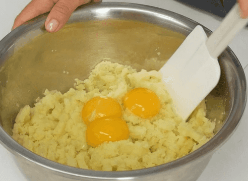 В картофель добавить муку, желтки, половину поджаренного масла и 1 столовую ложку соли. Вымесить однородное тесто.