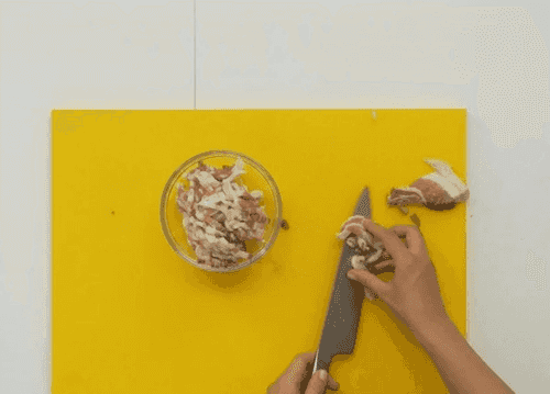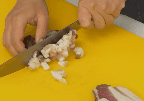Вторую половину шпика нарезать тонкими ломтиками и поджарить на сковороде с обеих сторон. Выложить на бумажные полотенца, чтобы избавиться от лишнего жира.