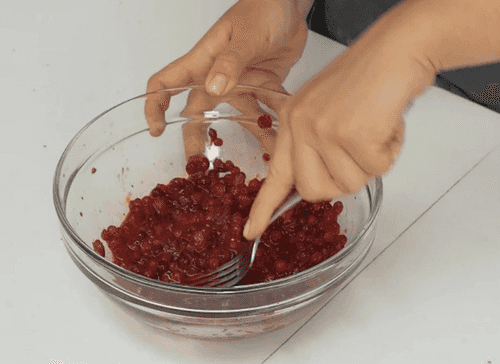 Бруснику немного подавить вилкой с сахаром до неоднородной массы.