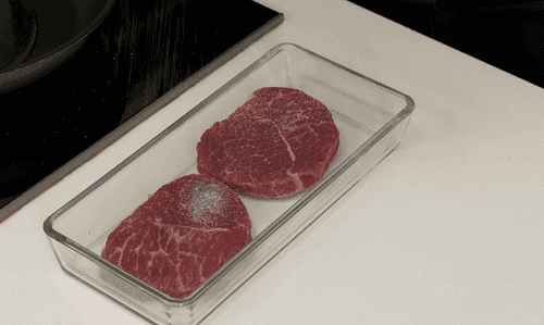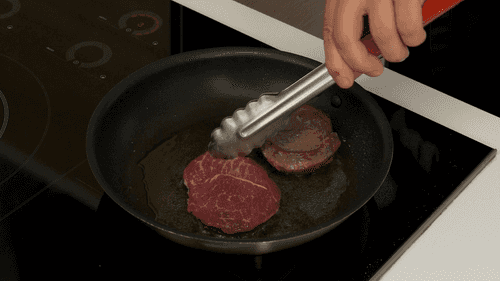 Ближе к концу жарки добавить 30 грамм сливочного масла и поливать горячим растопленным маслом стейки. При необходимости довести стейки в духовке до готовности при 180 градусах.