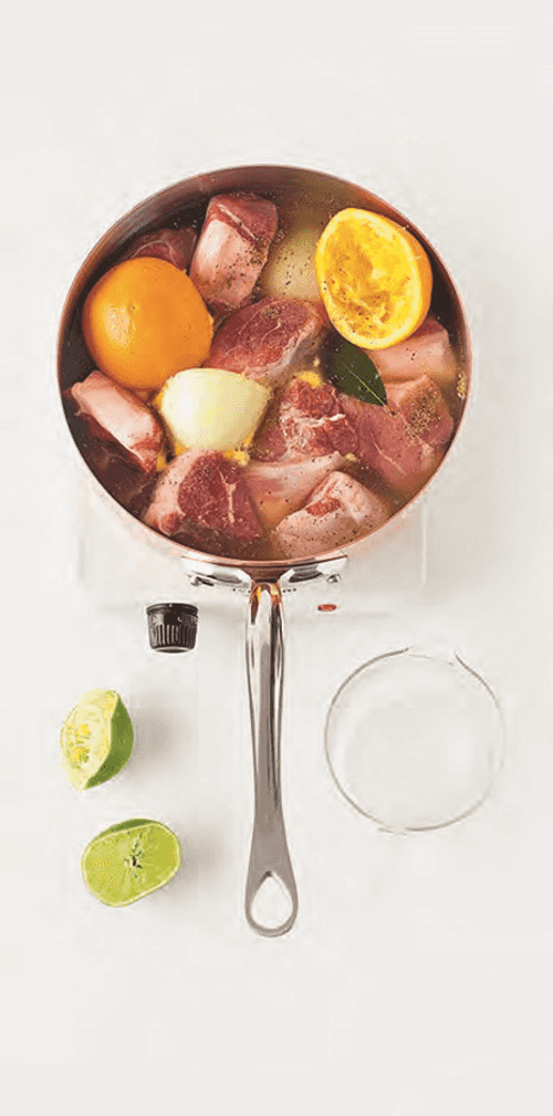 Разогреть духовку до 150 градусов. Очистить лук и разрезать его пополам. Помыть апельсин и выжать сок. В кокотнице смешать мясо, соль, перец, лавровый лист, лук, сок лайма, сок и кожуру апельсина (без косточек) и столько воды, чтобы только покрыть мясо. На сильном огне, время от времени помешивая, довести до легкого кипения.
