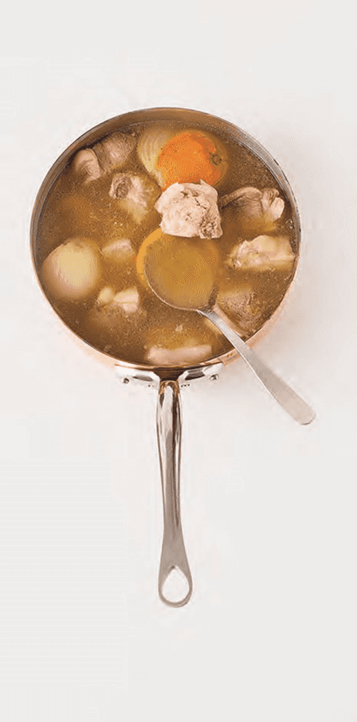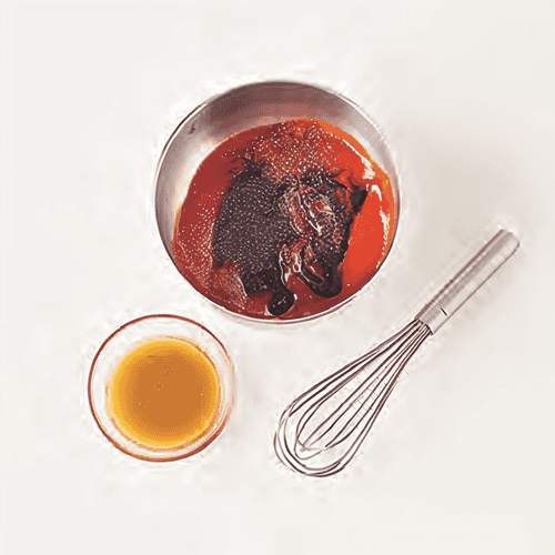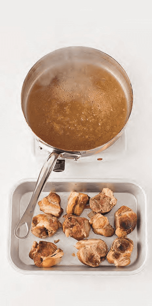 Декантировать мясо. Выбросить апельсиновую кожуру, лук и лавровый лист. На сильном огне выпарить жидкость, пока она не приобретет консистенцию сиропа. 40 мл сиропа процедить через сито шинуа и оставить. Разогреть духовку в режиме гриль.
