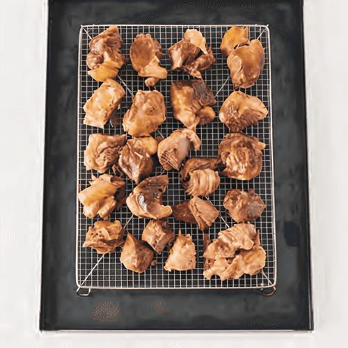 Разложить куски мяса на решетке над противнем. 8–10 минут подрумянивать под грилем на нижнем уровне. Через 4 минуты перевернуть мясо.