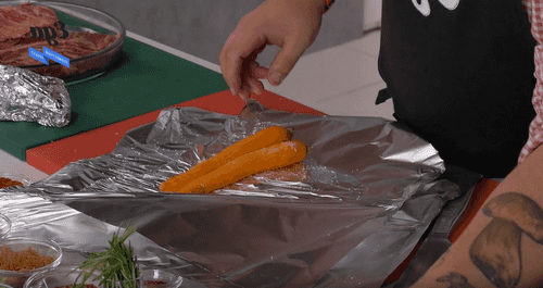 Почистить морковь и свеклу, посолить, полить оливковым маслом, отдельно завернуть свеклу и морковь в фольгу и отправить в духовку, разогретую до 200 градусов, на 40-50 минут, запекать до мягкости.