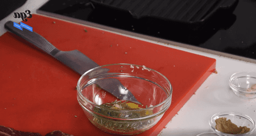 Смешать кориандр, кумин, сушеные лук и чеснок, копченую паприку, коричневый сахар, черный перец и соль — всего по половине столовой ложки. Смазать стейк оливковым маслом и втереть сухой маринад в мясо. Оставить на 2 часа или больше.