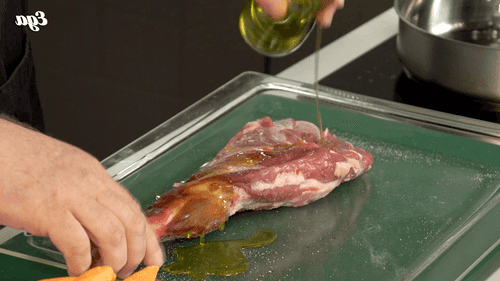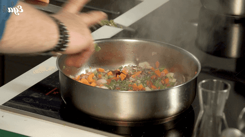 В сковороде разогреть растительное масло, на сильном огне карамелизовать овощи. Порубить листья розмарина и добавить к овощам. Добавить столовую ложку муки и мясной сок из противня, литр воды и тушить час.