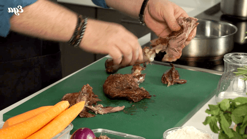 Снять мясо с кости, нарезать крупно. Морковь, сельдерей и лук нарезать крупным кубиком.
