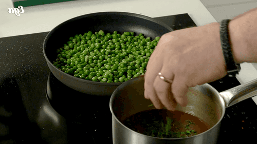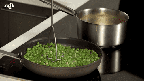 Растопить сливочное масло, добавить соль и быстро прогреть горошек, слегка помять его толкушкой.