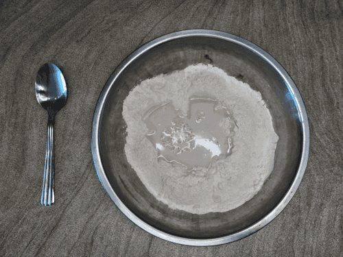 Муку насыпать в миску, сделать ямку, посолить (2–3 щепотки), влить воду и вымесить, пока не получится плотный комок эластичного теста. Если получится слишком жидкое, добавить муки. Тесто завернуть в пакет и отправить в холодильник на 40 минут.