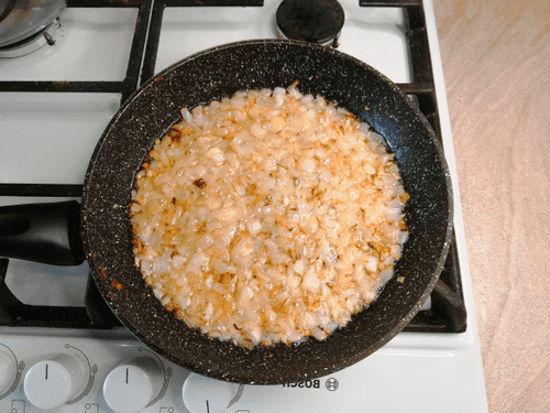 Лук нарезать мелкими кубиками и выложить в сковородку. Залить обильно маслом и жарить на сильном огне до слегка золотистого цвета, не пережарить, иначе лук превратится в гальку.