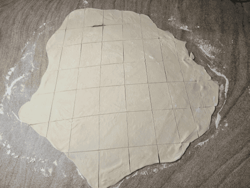 Стол посыпать мукой. Взять отдохнувшее тесто и раскатать в тонкий лист. Нарезать его на кубиками.