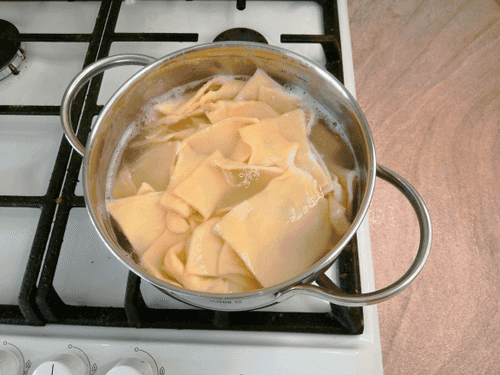 В кипящую воду добавить половину столовой ложки соли и закинуть квадратики теста. Варить как пельмени. Как только квадраты всплывут через 2–3 минуты, слить все через дуршлаг.