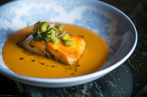 В тарелку налить соус том ям. В него выложить рыбу, сверху на палтус выложить овощи соте.