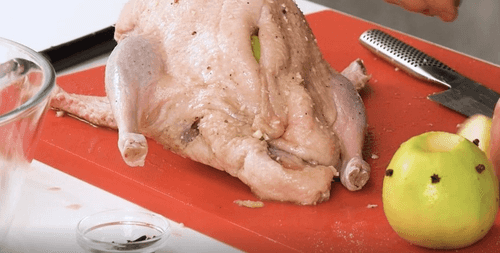 У 2–3 небольших яблок удалить сердцевину, воткнуть в них гвоздику и поместить внутрь утки. Утку положить в рукав для запекания и отправить в духовку, разогретую до 200 градусов, на полтора часа.