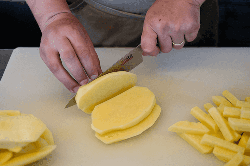Срезать с двух длинных сторон первые скругленные сверху ломтики и отложить их — теперь картофель можно поставить на длинный срез и он не будет кататься. Затем нарезать его длинными брусками с палец толщиной на манер картошки фри. Можно нарезать иначе, как больше нравится.
