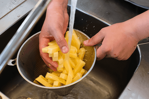 Промыть нарезанный картофель под проточной водой. Крахмал, который есть на поверхности картофеля, удерживает влагу, и, если картофель, не промыв, закинуть в сковородку, вода начнет испаряться и понижать температуру. Нужно, чтобы картофель сразу же начал жариться, поэтому нужно убрать лишний крахмал, а потом и воду. Промытый картофель откинуть на полотенце и оставить сохнуть минут на 10–15.