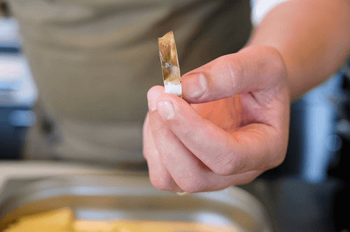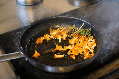 Выложить из сковороды белые грибы и бросить в то же масло лисички, добавив к ним несколько веточек тимьяна, перевязанных шпагатом, чтобы потом не вынимать по одной ветке. Лисички надо перемешать, но не надо делать это активно: пару раз подкинули, чтобы они перевернулись на 180 градусов, и достаточно. Готовятся они тоже около 5 минут. За 30 секунд до окончания жарки добавить пару зубчиков чеснока, мелко нарубленных.