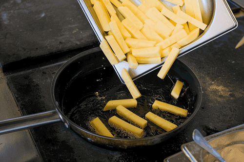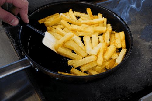 Высыпать бруски картофеля на раскаленную сковороду с маслом. Масла нужно столько, чтобы брусочки погрузились в него примерно наполовину. Точная пропорция будет зависеть от диаметра сковороды, но приблизительный слой масла должен быть глубиной вполовину меньше толщины пальца. Как только масло задымится, можно всыпать картофель.