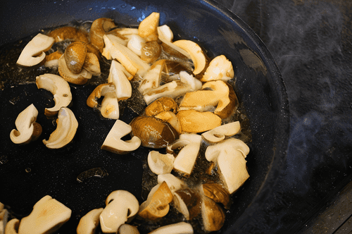 На другой сковороде разогреть масло и кинуть белые грибы. Белые жарятся очень быстро, они мгновенно начинают усыхать. Как только у них появится золотистый цвет, надо начинать помешивать. Грибы будут готовы за 5 минут.