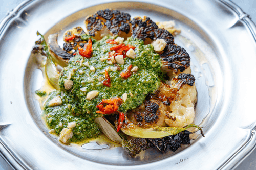 Стейк из цветной капусты с соусом чимичурри — это яркий и ароматный рецепт, который переосмысливает традиционные представления о стейке. Это блюдо сочетает хрустящую карамелизированную капусту с насыщенным травяным соусом чимичурри, который традиционно сопровождает мясные блюда, но здесь открывается с новой стороны. Глубокий вкус зелени — кинзы, петрушки и укропа, усиленный свежестью лимона и пряностью черного перца, создаёт гармоничное сочетание с нежной текстурой капусты. Это блюдо универсально: оно подойдет как основное вегетарианское блюдо или как эффектный гарнир. Украшенное фундуком и острым чили, оно привносит в трапезу игру текстур и вкусов. Такой стейк не только радует глаз, но и приятно удивляет своей сложностью, оставаясь при этом легким и полезным.