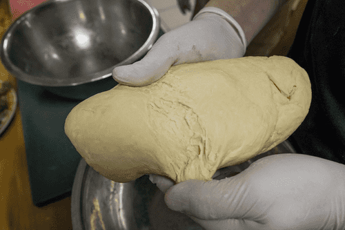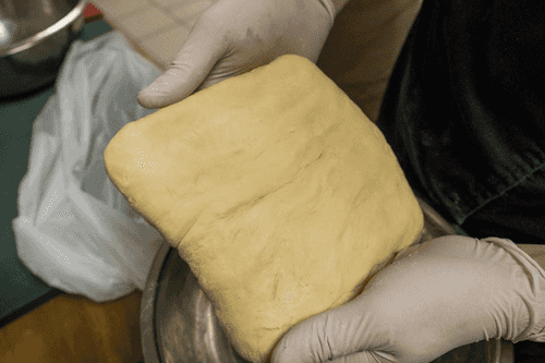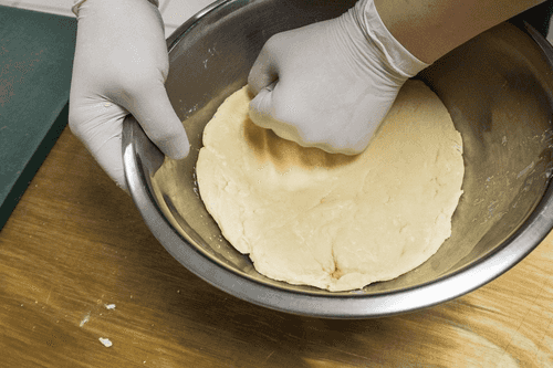 Готовое тесто надо убрать под пленку или в пакет на 30 минут. После того, как оно отдохнет, оно станет более эластичным.