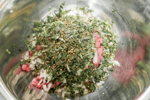 Телятину мелко порубить, добавить мелко нарубленный лук, соль (около 24 г), черный перец, зиру, кориандр, базилик, мяту, кинзу и растительное масло. Перемешать и оставить на 10 минут.