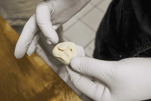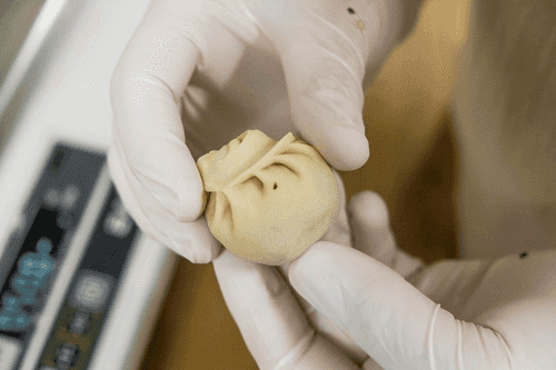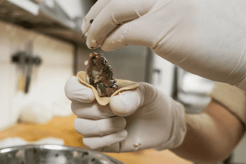 Затем достать кружки и встряхнуть их как следует, чтобы лишняя мука осыпалась. Положить кружок на кулак, так, чтобы серединка кружка приходилась на большой палец. Сделать небольшое углубление в тесте, положить туда 20 г фарша, как следует утрамбовать фарш внутрь, чтобы края теста оставались более-менее чистыми.