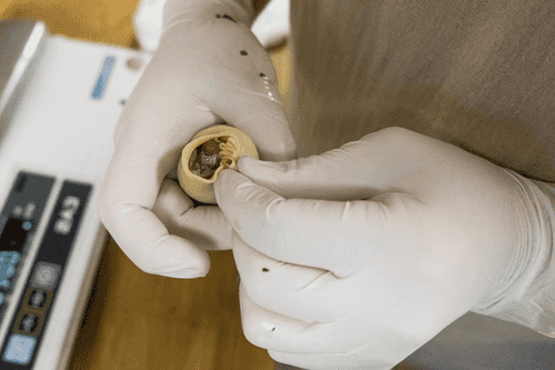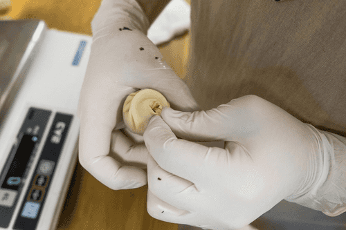 Разделить тесто на кусочки весом по 10 грамм. Все кусочки немного помесить, заворачивая края в серединку, чтобы шарики стали однородными, без рваных краев. Это делается для того, чтобы потом тесто легче и равномернее раскатывалось. Шарики теста убрать под пленку на 10 минут, чтобы они не заветрились.